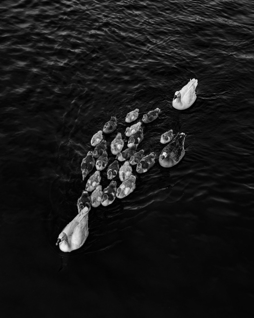 Raft of ducks wake the morning with quacks of faburden during their swimβfor harmony via melodic milieu sounds hope for ears to limn. ; )