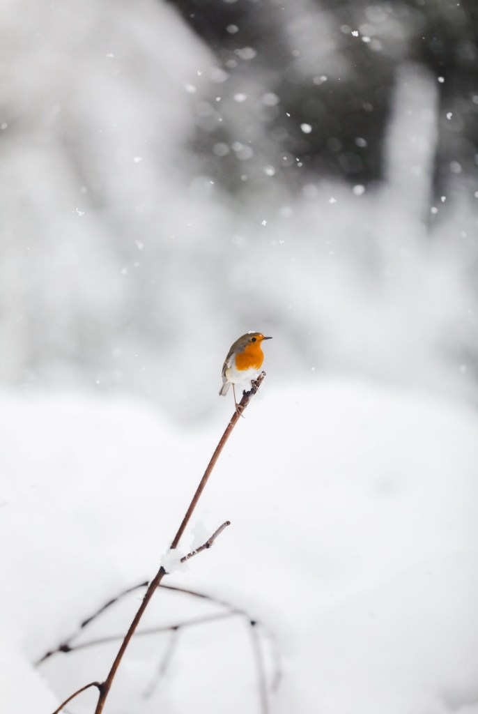 Tweetlingβs fiery breast, conspicuously lost from agoβs vibrant spring, smarts as flake-fall starts. But, gelid breeze that does numb its feet and pause its song can only frost as fleetingβno match for a feathery flame of hope whose heart burns to survive a season longer. ; )